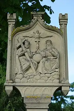 Das Dreifaltigkeits-Relief zeigt Gottvater (rechts), Jesus Christus als Sohn mit Kreuz (links) sowie den Heiligen Geist, dargestellt in Form einer Taube (oben mittig). Vater und Sohn sind gekrönt dargestellt und ihre Hände berühren sich mittig über einer Kugel. Der Vater hält dabei ein Zepter in der Hand, das mit der Taube verbunden ist. Von der Taube gehen Strahlen in alle Richtungen aus.[2]