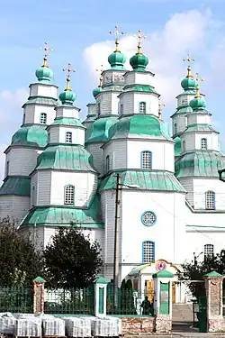 Die Kathedrale ist ein außergewöhnlicher Kreuzkuppelbau in der Holzarchitektur der Ukraine, ein Denkmal des ukrainischen Barocks und das herausragendste Objekt dieser Bauweise.[2] Sie wurde von den Kosaken ohne Verwendung von Metallnägeln erbaut. Baubeginn war der 2. Juni 1775, die Einweihung des Hochaltars fand am 13. Mai 1778 und die Fertigstellung am 10. September 1780 statt. Der nebenstehende Glockenturm wurde später ergänzt.[3]