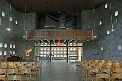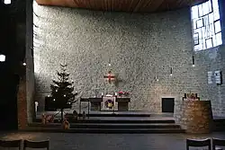 Rechtwinklig dazu tritt man in den Innenraum der Kirche der ebenfalls von Natursteinwänden geprägt ist. Kennzeichnend ist die besondere Lichtführung. Ein großes Fenster im Südwesten lässt viel Licht in den Altarraum einfallen. Die etwa vierzig kleinen sechseckigen Fenster in Süd- und Nordwand sorgen ansonsten für eine zurückhaltende Beleuchtung. Sie sind auf der einen Seite regelmäßig und in der anderen Wand unregelmäßig angeordnet. Sämtliche Fenster wurden von Hans Heinrich Adam geschaffen. Eine runde wandhohe Nische in der Südwand mit kleinen Fenstern bildet die Taufkapelle. Die Decke ist baldachinartig und besteht aus akustischen Gründen aus Holzleisten. Die Bestuhlung bietet etwa 330 Personen Platz.