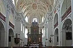 - Hauptaltar mit den Gemälden von Mariä Himmelfahrt und der hl. Dreifaltigkeit und den Statuen des hl. Wenzel (links unten), des hl. Michael (rechts unten), des hl. Franziskus Xaverius (in der Mitte links), des hl. Adalbert (in der Mitte rechts). des hl. Sebastian (links oben) und des hl. Rochus (rechts oben)