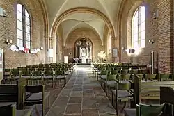 Die mit zehn vorgesetzten gemauerten Stützen gesicherte einschiffige Backsteinkirche besitzt eine gewölbte Decke und wird im Innern in natürlicher Weise durch Bogenfenster belichtet. Nach Westen vorgesetzt ist ein hoher, rechteckiger Mauerwerksturm, der eine Kirchturm-Bedachung aus Kupfer besitzt.