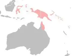 Das Verbreitungsgebiet der Dreifarben-Papageiamadine ist Sulawesi, die Molukken, der Bismarck-Archipel, Neuguinea, Melanesien und die Kap-York-Halbinsel. Auf Neuguinea reicht ihre Höhenverbreitung während der Brutzeit von 800 bis 2000 Meter über NN. Nach der Brutzeit ziehen die Dreifarben-Papageiamadinen dagegen von den Bergwäldern in die Niederungen.[2] Die Vögel besiedeln vor allem Waldränder und Plantagen im Flachland und im Gebirge. Auf der Kap-York-Halbinsel leben sie am Rand von Regenwäldern und in feuchtem Grasland. Auf den Neuen Hebriden kommen sie in großer Zahl auf Plantagen vor, die große Grasflächen aufweisen. Während der Samenreife der Gräser finden sich hier zum Teil sehr große Schwärme ein. Dreifarben-Papageiamadinen sind allgemein sehr scheu und leben während der Brutzeit paarweise. Nach der Brutzeit kommen sie auch in Schwärmen von bis zu 100 Vögeln vor. Während der heißesten Tageszeit ziehen sie sich in den Schatten von dichtem Gebüsch zurück.