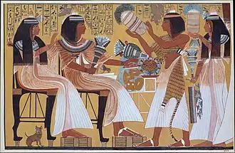 Zu festlichen Anlässen wurden die Seitenstränge an ihren Enden mit goldenen Spangen zusammengehalten und beschwert. Auf dem Kopf trug man dann eine kleine Blumenkrone aus Lotos-, Akazien- und/oder Margeritenblüten oder einen Duftkegel aus Wachs. Eine dreigeteilte Frisur konnte aus dem echten Haar bestehen oder eine Perücke sein. Die Haartracht scheint bei Männern wie Frauen gleichermaßen beliebt gewesen zu sein.[2]