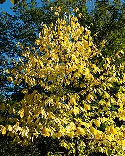 Die kurz gestielten und wechselständigen, papierigen Laubblätter sind verkehrt-eiförmig bis -eilanzettlich, fast kahl und etwa zwischen 15–30 cm lang und 10–15 cm breit. Der kurze Blattstiel ist bis etwa 1 cm lang. Sie sind ganzrandig und rundspitzig bis spitz oder bespitzt bis zugespitzt. Der Blattrand ist manchmal leicht umgebogen. Junge Blätter sind unterseits haarig und oberseits sind die Blätter spärlich auf den Adern behaart, sie verkahlen dann fast ganz. Die Herbstfärbung ist gelb. Die Blätter verströmen nach dem Zerreiben einen unangenehmen Duft.
