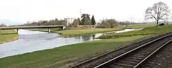 ![]() Das Schwabentorwehr der Dreisam in Freiburg unterhalb der Schwabentorbrücke vor 2019, heute befinden sich hier die Wasserterrassen | ||