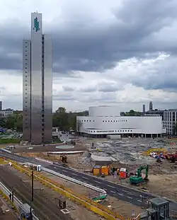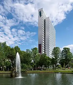 1955 aus einem Wettbewerb der Phoenix-Rheinrohr AG Vereinigte Hütten- und Röhrenwerke hervorgegangen, wurde der mit einer Vorhangfassade bekleidete Stahlskelettbau, dessen Gestalt an parallel zueinander und aufrecht stehende Brammen erinnert, in den Jahren 1957 bis 1960 von den Düsseldorfer Architekten Helmut Hentrich und Hubert Petschnigg zusammen mit den jungen Architekten Fritz Eller, Erich Moser und Robert Walter errichtet.[2] Zu Beginn des Wettbewerbsverfahrens hatten die Architekten Hentrich und Petschnigg noch eine „Variante des Pirelli-Hochhauses“ vorgeschlagen, dann aber waren sie nach einer gemeinsamen Reise in die USA, an der auch der Düsseldorfer Beigeordnete Friedrich Tamms teilgenommen hatte, durch den Rat ihrer amerikanischen Kollegen zu der Überzeugung gelangt, dass das Bürohochhaus in Form der schließlich realisierten Lösung entwurflich auszuarbeiten ist.[3] Tragwerkplaner war Kuno Boll. Der Bauherr war die Phoenix-Rheinrohr AG Vereinigte Hütten- und Röhrenwerke mit ihrem illustren Generaldirektor und Wirtschaftswunder-Vorzeigeunternehmer Fritz-Aurel Goergen (bis 1957), die dort ihren Firmensitz einrichtete (1964 Übernahme durch die Thyssen AG). Deshalb wurde der Bau anfangs auch ‚Prinz Aurels Pyramide‘ genannt. Im Erdgeschoss war 1961 die damals hochmoderne Datenverarbeitungsanlage IBM 7070 installiert.[4] Seit der Fusion von Thyssen und Krupp im Jahr 1999 war ein Teil des Firmensitzes der ThyssenKrupp AG in dem Hochhaus untergebracht.[2] Im Frühjahr 2007 verkündete Thyssen seinen Wegzug aus Düsseldorf und verkaufte die Immobilie für geschätzte 100 Millionen Euro an die Immobilienfonds-Tochter RREEF der Deutschen Bank. Der Umzug in das Essener Thyssenkrupp-Hauptquartier erfolgte im Juni 2010. Im Juni 2011 wurde bekannt, dass das Gebäude für 72 Millionen Euro an die Momeni Projektentwicklung GmbH weiterverkauft wurde. Die neue Eigentümerin plante, das Gebäude bis zum Jahr 2013 denkmalgerecht umzubauen.[5][6] Hinter dem Käufer hat die Black-Horse-Investment (BGI) der Familie Schwarz-Schütte in Düsseldorf, den früheren Eigentümern von Schwarz Pharma, die Finanzierung gesichert.[7]