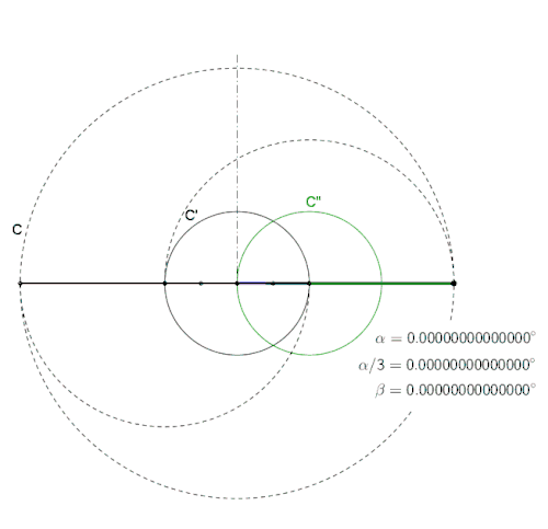 Das Problem der Konstruktion eines Winkels von gegebener Größe ist äquivalent zur Konstruktion zweier Strecken, deren Längen im Verhältnis stehen. Die Lösung eines dieser beiden Probleme mit Zirkel und Lineal ergibt die Lösung des anderen. Mithilfe der Formel zum Kosinus des dreifachen Winkels[31]