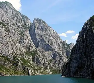 Bei der nordostalbanischen Stadt Kukës vereinigen sich der von Nordosten kommende Weiße und der von Süden kommende Schwarze Drin. Der Flusslauf ist in den Nordalbanischen Alpen, die westwärts durchquert werden, beinahe ausnahmslos gestaut. Beide Oberläufe speisen den Fierza-Stausee, der den Weißen Drin bis über die Grenze nach Kosovo staut, rund 72,5 Quadratkilometer groß und bis zu 128 Meter tief ist. Der folgende Koman-Stausee dient in der abgelegenen Bergregion auch als Verkehrsweg. Neben einer Personenfähre, die die kleinen Weiler entlang des Sees bedient, verkehren im Sommer zwei Autofähren zwischen den Anlegestellen Fierza und Koman (Stand Juni 2015).[6] Der Koman-See ist rund zwölf Quadratkilometer groß und hat eine maximale Tiefe von 96 Metern. Die Staumauer von Vau-Deja, die den Vau-Deja-Stausee bildet, befindet sich am westlichen Rand des Gebirges. Der letzte Stausee hat eine Fläche von 24,7 Quadratkilometer und ist bis zu 52 Meter tief.