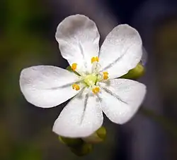 Die Staubblätter sind rund 2,5 mm lang. Der Fruchtknoten ist umgekehrt eiförmig, 1 Millimeter lang, während der Blüte mit einem Durchmesser von 1,4 Millimetern und drei Fruchtblättern, die breitlich zweigelappt sind. Die drei Griffel sind inklusive der Narben 0,8 Millimeter lang und im oberen Teil in viele verschiedene Abschnitte geteilt, die in verbreiterten, unregelmäßig geformten Narben enden.