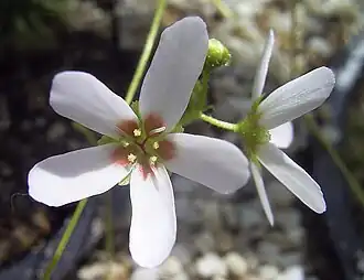 Blütezeit ist Oktober bis November. Die ein oder zwei Blütenstände sind bis zu 4 cm lang und der Schaft ist mit einigen Drüsen besetzt. Deren Verteilung wird zur Spitze hin immer dichter. Der Blütenstand ist ein Wickel aus 6 bis 12 Blüten an rund 2 mm langen Blütenstielen. Die eiförmigen Kelchblätter sind 2 mm lang und 1 mm breit. Die Oberfläche ist ebenfalls mit zylindrisch gestielten, rotspitzigen Drüsen besetzt. Die weißen oder hellrosa gefärbten Kronblätter sind an der Basis rötlich, eiförmig, 6 mm lang und 3,5 mm breit.