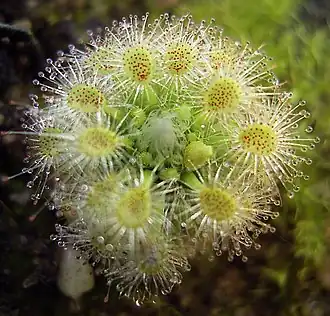 Blütezeit ist Oktober. Der Blütenstand ist bis zu 5 cm lang und an der Basis sparsam, zur Spitze hin immer dichter mit winzigen Härchen besetzt. Der Blütenstand ist ein Wickel aus 6 bis 8 Blüten an rund 1,5 mm langen Blütenstielen. Die breit eiförmigen Kelchblätter sind 3 mm lang und 2 mm breit. Die Ränder sind an der unteren Hälfte glatt, der Rest ist unregelmäßig gekerbt. Die Oberfläche ist unregelmäßig mit zylindrischen rotköpfigen Drüsen besetzt. Die Kronblätter sind metallisch-orangen, an der unteren Hälfte schwarzbraun, umgekehrt eiförmig, an der Spitze leicht gekerbt, 7 mm lang und 6,5 mm breit.