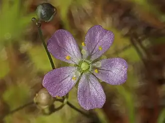 Die Blütenstandsachse ist mit Blütenstand 25 bis 45 Millimeter, ohne 20 bis 25 Millimeter lang und spärlich mit gestielten Drüsen besetzt. Der Blütenstand ist ein Wickel, die Blütenstiele sind 2,5 bis 3 Millimeter lang und verlängern sich bei der Reifung der Frucht nicht. Die Tragblätter sind ahlen- bis fadenförmig und mit Drüsenhaaren besetzt. An den Blütenständen stehen sechs bis zwölf Blüten. Die 2,0 bis 2,3 Millimeter langen und 0,8 bis 1,3 Millimeter breiten Kelchblätter sind „schmal eiförmig“ bis eiförmig. Die umgekehrt-eiförmigen bis keilförmigen Kronblätter sind pink bis weiß mit grauer Mittelrippe und grünem Ansatz, 4 bis 6 Millimeter lang und 3,5 bis 6,5 Millimeter breit.