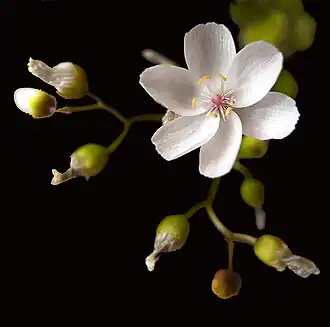 Blütezeit ist von August bis November, sommerliche Buschbrände lösen in der Regel Massenblüten aus[1]. Die unbehaarte Blütenstandsachse trägt eine einfache Traube oder eine zwei- bis vierfach verzweigte Schirmrispe, meist endständig und 7 bis 12 Zentimeter lang und mit 8 bis 35 Blüten. Die Blütenstiele sind unbehaart und 5 bis 10 Millimeter lang. Die Kelchblätter sind grün, breit eiförmig und zugespitzt und erreichen eine Länge von 3,5 bis 4,5 Millimeter und eine Breite von 1,5 bis 3 Millimeter, die Ränder sind einfach, an der Spitze selten schwach gezähnt, dicht mit schwarzen Punkten übersät und fein papillös. Die Kronblätter sind umgekehrt eiförmig, an der Spitze stumpf und leicht gekerbt. Ihre Grundfarbe ist weiß, sie sind 7,5 bis 10 Millimeter lang und 5 bis 8 Millimeter breit. Die fünf Staubblätter sind zwischen 2,5 und 3 Millimeter lang und vollständig weiß, der Pollen ist gelb. Der dunkelrote Fruchtknoten ist annähernd rund, papillös, knapp 1 Millimeter lang und hat in der Blütezeit einen Durchmesser von rund 1,8 Millimeter, die drei Fruchtblätter sind zweigelappt. Die drei Griffel sind weiß und am Ansatz rot überhaucht, sie sind insgesamt rund 1,5 Millimeter lang und am Ansatz in viele Abschnitte geteilt, gelegentlich wiederholt. Die Narben sind gerundet und leicht verdickt.