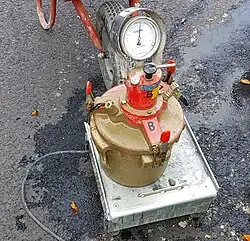Für das Druckausgleichsverfahren wird ein spezieller Behälter benötigt. Dieses Luftgehaltsprüfgerät (auch Luftporenmesstopf oder umgangssprachlich LP-Topf genannt) besteht aus einem mindestens fünf Liter fassenden Topf und einem dazugehörigen Deckel mit einer kleinen Druckkammer und einem Manometer. Der Frischbeton wird lagenweise in den Topf gegeben, bis dieser randvoll ist und dabei (i. d. R. mit einem Rütteltisch) verdichtet. Nach dem Schließen des Topfes wird der verbleibende Hohlraum unter dem Deckel über zwei Ventile mit Wasser aufgefüllt, sodass, abgesehen von den Luftporen im Beton, keine Luft im Behälter ist. Mit einer (Hand-)Pumpe wird anschließend in der Druckkammer des Deckels ein definierter Luftüberdruck erzeugt. Die Messung des Luftgehalts im Beton erfolgt dann durch einen Druckausgleich zwischen Druckkammer und Topf, indem ein drittes Ventil geöffnet wird. Auf dem Manometer kann sofort der Luftgehalt in Volumenprozent abgelesen werden. Je nach verwendeter Gesteinskörnung muss ein Korrekturfaktor berücksichtigt werden.[2]