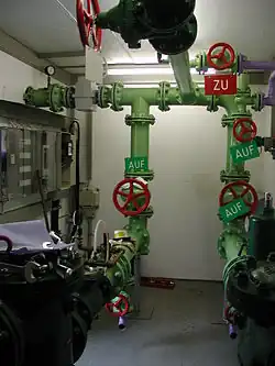 Zahlreicher jedoch sind die Druckermäßigungsanlagen. Sie sind in kleinen, von außen eher unscheinbaren, bunkerartigen Bauwerken untergebracht. Hier befinden sich Rohrsysteme und automatisch arbeitende Druckminderer, die vom Energieversorger regelmäßig gewartet und kontrolliert werden, um die Gleichmäßigkeit des Drucks zu gewährleisten.[1]