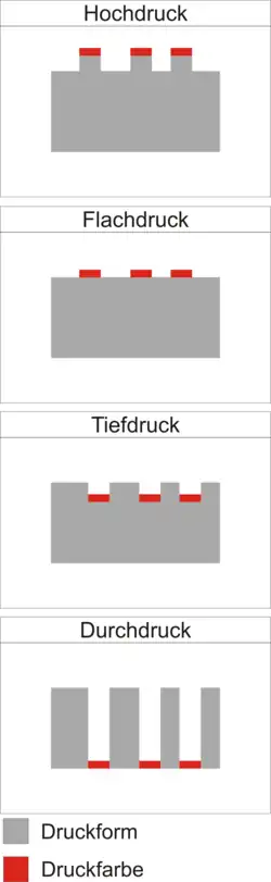 - Hochdruck: Bildstellen der Druckform stehen höher als Nichtbildstellen, zum Beispiel Buchdruck und Flexodruck