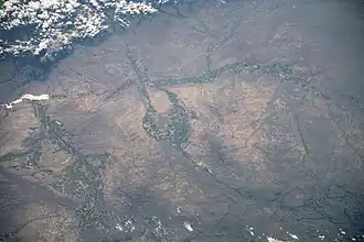 ![]() Aufnahme des Bighorn Basin während der ISS-Expedition 59. Der Dry Creek ist der linke der beiden Flüsse, die in der Bildmitte, von Westen (Vordergrund) kommend, in den Bighorn River münden. | ||