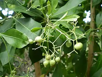 Blüte, Früchte und Blätter von Duboisia myoporoides | ||||||||||||
