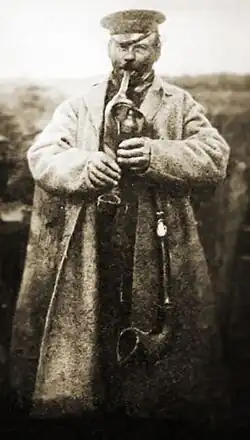 Ukrainische instrumentale Volksmusikensembles werden meist troista muzyka genannt, weil sie aus drei Musikern bestehen. In einem solchen Ensemble spielen beispielsweise Geige, Kernspaltflöte (sopilka) und Rahmentrommel (buben) oder Geige, Hackbrett (cimbalom) und Rahmentrommel zusammen.[60] Häufig wird auch die Sackpfeife in einem Ensemble eingesetzt.[61] Zbigniew Jerzy Przerembski (2009) weist jedoch darauf hin, dass in der Ukraine (wie in Polen) in den ersten Jahrzehnten des 20. Jahrhunderts das Wort muzyka hauptsächlich das Geigenspiel – solo oder in einem Ensemble – bezeichnete. Das Spiel etwa von Sackpfeifen, Drehleiern (lira), Lauten (kobsa) und Holztrompete (trembita) wurde demnach nicht muzyka genannt, dagegen gehörten die Spieler der genannten Instrumente meist einschließlich dem Sackpfeifer (dudziarz) durchaus zu den professionellen Musikern (muzykanci).[62]
