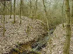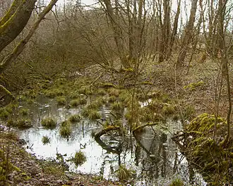 ![]() Dudenrother Schanze (rechts), aus westlicher Richtung vom inneren Wall aus fotografiert. Im Vordergrund ist der mit Wasser gefüllte innere Graben zu erkennen. | ||
