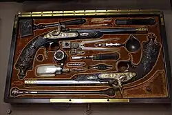 Wegen des offiziellen Duellverbots wurden die Vorbereitungen möglichst geheim gehalten und Duelle meist in den frühen Morgenstunden an abgelegenen, einsamen Orten durchgeführt. Außer den Duellanten waren ein Arzt und die beiderseitigen Sekundanten, eventuell auch noch ein Unparteiischer anwesend, der gemeinsam mit den Sekundanten über die ordnungsgemäße Durchführung wachte. Die Waffen mussten für beide Kämpfer genau gleich sein. Als Pistolen benutzte man ausschließlich einschüssige Vorderladerwaffen, die mit Schwarzpulver und bleiernen Rundkugeln im Kaliber 12 bis 17 mm geladen wurden. Die Treffergenauigkeit dieser Waffen, die oft noch glatte, nicht gezogene Läufe hatten, war auf größere Entfernung nur gering; andererseits waren Verletzungen durch die großkalibrigen Geschosse schwer und führten oft noch Tage nach dem eigentlichen Duell zum Tod.