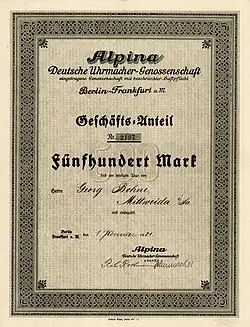Dugena ist aus der 1899 gegründeten Generalvertretung der Schweizer Uhrenmarke Alpina in Berlin hervorgegangen.[1] 1917 gründete sich hieraus die Deutsche Uhrmacher-Genossenschaft Alpina in Eisenach.[1] Das hieraus gebildete Kunstwort Dugena wurde allerdings erst auf der Generalversammlung der Genossenschaft des Jahres 1942 als alleiniger künftiger Markenname festgelegt.[1] Zweck der Genossenschaft war der Vertrieb ausgewählter Qualitätsuhren aus Deutschland zu moderaten Preisen.[1] 1927 wurde der Firmensitz nach Berlin verlegt.