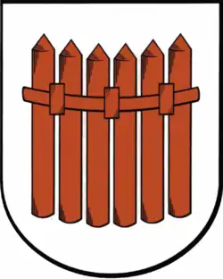 Das Wappen der Gemeinde wurde am 25. Juni 2020 vom Innenminister des Landes Mecklenburg-Vorpommern genehmigt. Blasonierung: „In Silber sechs rote von drei Ankerhölzern und einem Querriegel gehaltene, mit Abstand im Bogen angeordnete Palisaden.“[20]