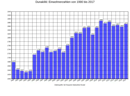 2017 lebten in Dunakiliti 1873 Bürger. Dieser Wert ist seit 1990 tendenziell ansteigend. Die zunehmende Einwohnerzahl lässt sich durch eine große Anzahl von Pendlern erklären, welche sich in Dunakiliti niederlassen und ihrer beruflichen Tätigkeit in Bratislava nachgehen. Diesem Trend zur Folge hat die Gemeinde neben der überwiegend ungarischen Bevölkerung von 98,7 %. auch eine slowakische Minderheit von 0,2 %. 4,5 % der Einwohner Dunakilitis sind deutschsprachig.[2]