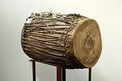 Laut dem Natyashastra gab es hundert verschiedene Trommeln (avanaddha). Es werden drei Gruppen von Trommeln unterschieden: Die erste Gruppe der aus Ton hergestellten Trommeln wird nach Form und Spielhaltung in mehrere Typen eingeteilt. Die zweite Gruppe (pushkara) beinhaltet fassförmige und sanduhrförmige Trommeln mit einem hölzernen Korpus. Die Sanduhrtrommel panava mit veränderlicher Schnurspannung (wie die südindische idakka) wird als bedeutend für die Theatermusik erwähnt.[8] Zur dritten Gruppe gehören alle Trommeln mit unbestimmter Tonhöhe, die nicht in Musikensembles verwendet wurden, namentlich die bheri, eine zweifellige, wahrscheinlich fassförmige Kriegstrommel aus Kupferblech, die einen schreckenerregenden lauten Ton hervorbrachte,[9] die pataha, eine langgestreckte Fasstrommel aus Holz, die bis etwa ins 12. Jahrhundert bekannt war,[10] die bhambha, die ebenfalls laut und tief tönende, zweifellige Sanduhrtrommel dindima aus Holz und die dundubhi. Als Grund, weshalb die Trommeln der dritten Gruppe als Musikinstrumente ungeeignet erschienen, nennt das Natyashastra außer den ungenauen Tonhöhen die hierfür fehlenden Sprachsilben (bol) und die nicht festgelegten Schlagfolgen. Es ging bei dieser Trommelgruppe rein um das lautstarke, angsteinjagende dumpfe Dröhnen, das durch Schläge mit schweren keulenförmigen Hölzern erzeugt wurde.