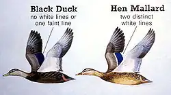 Im Flug heben sich die weißen Unterflügel auffällig von den dunklen Körperseiten ab.[9] Die Stimme ähnelt sehr der der Stockente, allerdings ist der Ruf des Weibchens einen Ton dunkler.