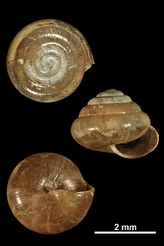 Das rechtsgewundene Gehäuse ist gedrückt-konisch, der Gesamthabitus ist leicht kugelig mit abgeflachter Basis. Es misst 3 bis 3,5 mm in der Breite und 3 bis 3,5 mm in der Höhe, und ist damit etwa gleich hoch wie breit. Es sind fünf Umgänge vorhanden, die langsam und regelmäßig zunehmen. Die Peripherie der Umgänge ist eher flach gewölbt, die Nähte sind vergleichsweise tief. Die Außenlinie ist leicht konvex gebogen. Die Mündung steht schief zur Windungsachse und ist asymmetrisch mondsichelförmig. Die Basis ist deutlich konvex, und weniger stark abgeflacht, und der letzte Umgang ist kaum gekielt. Der Mundsaum ist einfach, gerade und nicht verdickt. Der Nabel ist durch die enge Aufwindung nicht oder kaum zu sehen.