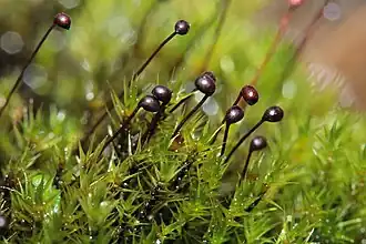 Die Sporenkapsel auf der 1 bis 1,5 Zentimeter langen Seta ist eiförmig-kugelig, um 1 Millimeter lang, glänzend rotbraun bis schwärzlich und waagrecht bis geneigt, der Kapseldeckel kegelförmig. Das äußere Peristom mit 16 unregelmäßigen Zähnen ist gelblich, das innere Peristom fehlt oder ist nur mit einer Zellmembrane angedeutet. Die feinwarzigen, bräunlich-gelbgrünen Sporen sind 38 bis 50 Mikrometer groß. Sporenreifezeit ist im Sommer. Die Geschlechterverteilung ist diözisch.