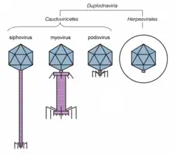 Caudoviricetes sind weltweit allgegenwärtig und sehr vielfältig, weshalb ihre Vertreter möglicherweise zu den ältesten Viren überhaupt gehören. Wahrscheinlich stammen die Herpesviren entweder von einem gemeinsamen Vorfahren mit den Caudoviricetes ab, wenn dieser in seiner Evolution eine Abstammungslinie (Klade) hervorgebracht hat, die Eukaryoten infizieren konnte; oder sie stammen ab von einem divergierenden Zweig innerhalb der Caudoviricetes.[7]