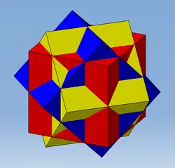 Die Durchdringung von drei Würfeln stellt ein Polyeder dar, das aus einer geeigneten Zusammenstellung von drei punktsymmetrischen Würfeln besteht. Dabei sind die Würfel zweifach gegeneinander in einem Winkel von jeweils 45° verdreht (die Drehachsen verlaufen durch die Mitten zweier paralleler Quadrate).