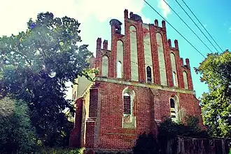 1722 wurde das Gotteshaus bei einem Gewitter nahezu vollständig zerstört, 1731 durch das Patronat aber in den alten Mauern wieder aufgebaut. Der um 1890 vorhandene Turm hatte im Erdgeschoss eine Mauerstärke von 2,6 m,[9] mehrere Geschosse, war 120 Fuß (≈ 37 m) hoch, mit einem vierseitigen Zeltdach abgeschlossen und trug zwei Glocken. Das Dach des Turms muss vor der Zerstörung 1722 eine andere Gestalt gehabt haben.[10] Das Kirchengebäude ist heute eine Ruine.