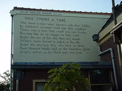 Von 1949 bis zu seinem Tod im Jahre 1953 lebte Thomas mit seiner Familie in einem notdürftig umgebauten, zweistöckigen Bootsschuppen an der Flussmündung des Tâf beim südwalisischen Fischerdorf Laugharne.[5] Laugharne war dabei Vorbild für den fiktiven Ort Llareggub aus dem in dieser Zeit entstandenen Stück Unter dem Milchwald. Um in Ruhe weiterhin Gedichte schreiben zu können, suchte er dafür den kleinen Erker auf der Burgmauer des verfallenen Laugharne Castle an der Küste auf.
