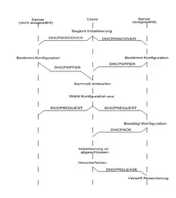 Wenn ein Client erstmals eine IP-Adresse benötigt, schickt er eine DHCPDISCOVER-Nachricht (mit seiner MAC-Adresse) als Netzwerk-Broadcast an die verfügbaren DHCP-Server (es kann durchaus mehrere davon im selben Subnetz geben). Dieser Broadcast hat als Absender-IP-Adresse 0.0.0.0 und als Zieladresse 255.255.255.255, da der Absender noch keine IP-Adresse besitzt und seine Anfrage „an alle“ richtet. Dabei ist der UDP-Quellport 68 und der UDP-Zielport 67. Die DHCP-Server antworten mit DHCPOFFER und machen Vorschläge für eine IP-Adresse. Das geschieht entweder mit einem Broadcast an die Adresse 255.255.255.255 mit UDP-Quellport 67 und UDP-Zielport 68 oder mit einem Unicast an die vorgeschlagene IP-Adresse und die MAC-Adresse des Clients, je nachdem ob der Client in der DHCPDISCOVER-Nachricht das Broadcast-Bit gesetzt hat.[2]