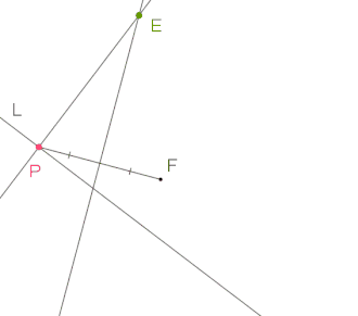 Bei gegebener Leitlinie und Brennpunkt wird zu einem Punkt auf ein Punkt der Parabel konstruiert. Dann zieht man den Punkt entlang der Leitlinie und hinterlässt die Spur seiner vorherigen Positionen und zeichnet damit die Parabel.