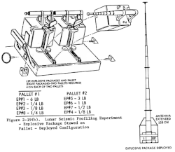 Das ASE ergänzte das PSE um drei Geophone, die in einer Linie von der Basisstation ausgelegt wurden. Daneben umfasste das ASE einen von den Astronauten bedienten „Klopfer“ (Thumper, Bild), der 22 Patronen zur Erzeugung kleiner Schocks enthielt, sowie vier größere Ladungen, die nach dem Verlassen des Mondes ferngezündet wurden. Ziel war die seismische Erkundung der Landestelle in mehrere hundert Meter Tiefe. | x | x | |||||