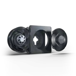 Alternativ sind weiterhin klassische AC-Motoren für 1- oder 3-Phasen-Wechselstrom erhältlich. Die hergestellten Ventilatoren besitzen Axial- oder Radiallüfterräder zwischen circa 20 mm und über 1250 mm Durchmesser und werden ebenfalls selbst entwickelt. Querstromgebläse, wie sie in der Fassadenlüftung eingesetzt werden, sind ebenfalls Teil des Produktprogramms. Die Lüfterräder sind entweder aus Kunststoff, Metall oder auch als Metall-Kunststoff-Materialkombination gefertigt. Diese neuartige Kombination ermöglicht bei gleichzeitiger variabler Formbarkeit hohe Festigkeiten, wie sie bei Metallrädern üblich sind.[59]