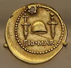 Nach dem Mord an Caesar und ihrer Flucht nach dem Osten begannen Brutus und sein Mitverschwörer Cassius mit der Ausgabe eigener Münzen, die zunächst unverfängliche Motive zeigten. Gold und Silber für die Münzen stammten von thrakischen Fürsten, die Brutus freiwillig unterstützten.[7][1] Während seiner Zeit als Prokonsul von Makedonien in den Jahren 43 und 42 v. Chr. ließ Brutus in einer beweglichen Feldmünze 12 verschiedene Münzen schlagen, vier Aurei, sechs Denarii und zwei Quinarii. In einer dritten Phase der Münzfertigung des Brutus, im Jahr 42 v. Chr., wurden Münzen ausgegeben, auf denen Brutus mit der Aufschrift IMP als Imperator bezeichnet wurde. Es handelt sich um sechzehn in einer Feldmünze geschlagene Münzen, sechs Aurei, neun Denarii und einen Quinarius.[4] Erst zum Ende der dritten und letzten Phase, im Sommer oder Frühherbst 42 v. Chr., wurden der Denarius und der Aureus mit dem Bildnis Brutus’ und dem Bekenntnis zum Mord an Caesar ausgegeben.[8]