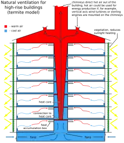 Im Eastgate Centre wurde ein bionisches Bürogebäude mit Lüftungselementen nach dem Prinzip der Termiten errichtet. In dem Gebäude kann nun praktisch fast ohne Heizung und Belüftungsanlage täglich gearbeitet werden. Dies funktioniert mit Hilfe von Luftschächten, die ein zusammenhängendes System bilden. So wird kühle Luft aus dem Atrium in das System gespeist, die dann anschließend durch Öffnungen in den Fußleisten in die einzelnen Räume gelangen kann. Das Gebäude besitzt zudem 48 Kamine, in denen sich passiv, wie bei den Termiten, die Luftmassen erwärmen. Diese Luftmassen werden nach dem Erhitzen abgesaugt und in Beton gespeichert. So steht sie nachts und morgens bei geringer/bis keiner Sonneneinstrahlung dennoch zur Verfügung. Durch dieses bionische Konzept liegt der monatliche Stromverbrauch dieses Bürogebäudes etwa bei der Hälfte von vergleichbaren Gebäuden in Harare.