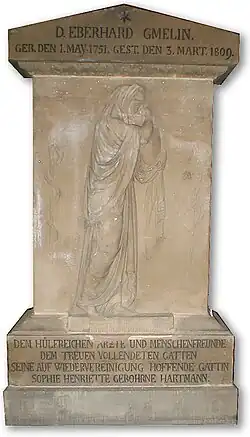 Johann Heinrich Dannecker fertigte den Grabstein von Gmelin an, der heute im städtischen Museum Heilbronn in der Eichgasse steht und die Göttin der Gesundheit Hygieia zeigt, die sowohl einen Äskulapstab als auch einen Ölzweig trägt.