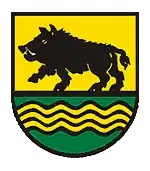 Das redende Wappen zeigt im grünen Schildfuß einen goldenen Querfluss, darüber in Gold einen schreitenden schwarzen Eber mit weißen Hauern.[6]