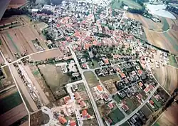 Die historische Ortsform von Ebing war die eines Angerdorfes. Im Osten gab es eine scharfe Abgrenzung durch den alten Mainlauf. Archäologischen Funden zufolge lag Ebing früher nördlich der Kirche und hat sich erst nach 1000 weiter südlich zu einem Großdorf entwickelt.[15] Heute ist Ebing vor allem im Südosten und Westen weit über den historischen Umfang hinaus gewachsen. Die ursprüngliche Ortsgrenze des Alten Mains zeigt sich im Südosten jetzt als begrünte Freifläche mit Altwasserresten. An sie schließt sich ein großflächiges Neubaugebiet an. Ein weiteres großes Siedlungsgebiet befindet sich im Westen im Bereich der Flur „Im Peunt“, wo die weitere Ausbreitung der Neubauten durch den ehemaligen Bahndamm begrenzt wird.[16] Im Rahmen der Dorferneuerung wurde der Marktplatz in den Jahren 1998–2000 vollkommen neu gestaltet. Die Einweihung fand am 14. Juli 2000 statt. Besonders hervorzuheben ist die in den vergangenen Jahren vorgenommene Sanierung des Pfarrhauses und die Instandsetzung der Kirche. Ebenso wurde die Sakristei erneuert. Bedeutende Bauprojekte wurden in den letzten Jahren in Ebing durchgeführt. Nach dem Baugebiet „Hergeten“ findet auch ein wahrer Bauboom Im „Unteren Dorf“ statt.[17] Am Ebinger Marktplatz befindet sich seit 1859 die Brauerei Schwanen Bräu, die noch immer selbst braut, und seit 1686 die ehemalige Brauerei Drei Kronen.[18]