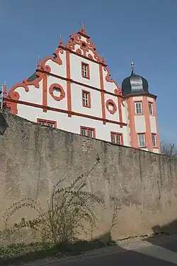 Die rechteckige Anlage mit Ecktürmen besitzt reich gegliederte Renaissancegiebel und ein aufwendiges Portal. In der Kapelle hat sich die bemalte Stuckdekoration der Bauzeit erhalten.