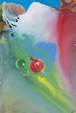 Umso bemerkenswerter ist es für das künstlerische Œuvre, dass es sich in den 2000er Jahren zur Öl- und Acrylmalerei auf Leinwand hin entwickelte. Eine Malweise, die sich gänzlich durch Zufall, Überarbeitungen und Spontanität auszeichnet. Ehraris aktuellster Katalog (2015)[16] listet und beschreibt zwölf dieser Werke, um auch die Hintergründe jeder Motivwahl zu verstehen. Auch dieser Beitrag wurde wie in früheren Katalogen von Kurt Scharf verfasst. Beispielsweise das Werk Der Granatapfel aus Sheki (2013) zeigt im Bildmittelpunkt einen leuchtend roten Granatapfel. Dieser verweist im Koran auf das Paradies. Allgemein besitzt dieses Symbol auch in anderen Religionen ausschließlich positive Attribute und erinnert in seinem Bildhintergrund an seine Wurzeln: die aserbaidschanische Berglandschaft.[17] Ebrahim Ehraris Werke zeichnen sich wie auch dieses durch die Darstellung von Konkretem in Kombination mit der Farbe in ihrer reinsten Form aus, mal mehr mal weniger. Der Hintergrund ist nur noch zum Teil als Landschaft erkennbar, der Rest spielt mit der Phantasie des Betrachters und lässt viel Raum zu einer eigenen Interpretation. Die Erkundung von Strukturen und Oberflächen sind außerdem weitere Charakteristika in Ebrahim Ehraris Malereien.