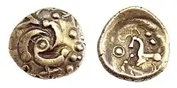- ↑ Eburonischer Goldstater Sch 31 I, Heinrichs, Verwicklung, S. 281ff. mit Abb.