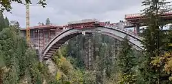 Die Arbeiten begannen am 8. November 1928 mit dem ersten von insgesamt 4712 Sprengschüssen. Als Konstruktion wurde das System der Melan-Spangenberg-Bauweise verwendet.[2] Hierbei wird das Stahlgerüst mit Kies vorbelastet und schließlich Schritt für Schritt durch eine gleich schwere Betonummantelung ersetzt. Von der West- und Ostseite wurde gleichzeitig begonnen, die beiden Stahlbögen im Freivorbau aufzubauen. Die Konstruktion gelang so genau, dass der West- und der Ostteil beim Bogenschluss lediglich zwei Zentimeter auseinanderlagen. Mit Öldruckpressen wurden die Fahrbahnlängsträger zusammengedrückt. 422 Tage nach Baubeginn konnte die Brücke für den Verkehr freigegeben werden. Zwischen 70 und 100 Mann arbeiteten an der Brücke.