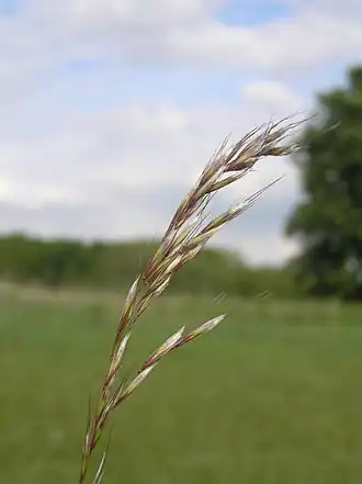 Die Blütezeit reicht von Mai bis Juli.[1] Der silberig glänzende, rispige Blütenstand ist 5 bis 20 Zentimeter lang und bis 2 Zentimeter breit und besitzt 5 bis 18 Ährchen.[1] Die Seitenäste sind bis 2 Zentimeter lang und tragen 1 bis 2 Ährchen.[1] Die Ährchen enthalten drei bis fünf, selten bis zu sieben Blüten und ist (ohne die Grannen) 18 bis 28 Millimeter lang.[1] Die Ährchenachse zerfällt zur Reifezeit.[1] Von den dreinervigen Hüllspelzen ist die untere 9 bis 14, die obere 12 bis 20 Millimeter lang.[1] Die Deckspelzen sind fünfnervig, 10 bis 16 Millimeter lang und tragen am Rücken etwa in der Mitte eine 12 bis 22 Millimeter lange Granne.[1] Die Untergranne ist 5 bis 7 Millimeter lang und gedreht, die Obergranne ist 10 bis 15 Millimeter lang und gerade.[1] Die Vorspelzen sind zweinervig und 9 bis 12 Millimeter lang. Die Staubbeutel sind 3 bis 6 Millimeter lang.[1]